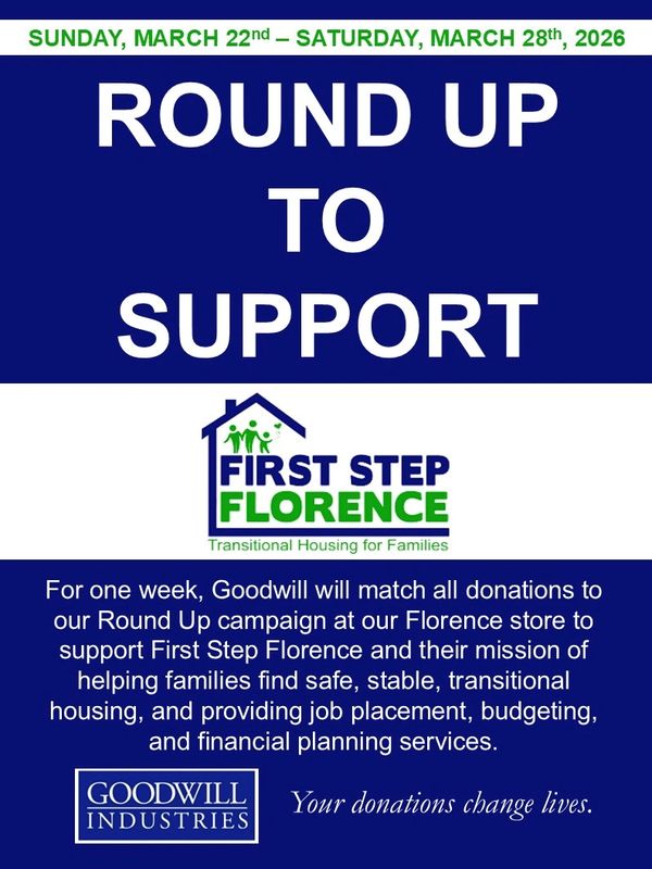 ROUND UP AT GOODWILL FLORENCE MARCH 22-28 to DONATE TO FIRST STEP!!